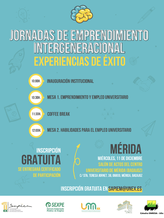 11/12/2024. La Cátedra Enresa-UEx ha colaborado con el Servicio de Apoyo a la Iniciativa Emprendedora de la UEx (SAPIEM) en las II Jornadas sobre Emprendimiento Intergeneracional, a través de experiencias de éxito, que se han celebrado el día 11 de diciembre de 2024 en el Centro Universitario de Mérida (CUMe).